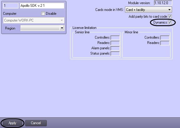 To write users, their cards and access levels to hardware click the Write VMS configuration button. To write these data to hardware automatically set the Dynamics checkbox on the settings panel of the Apollo SDK v.2 object and click the Apply button.