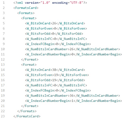 For this, open the FormatsCard.xml file located in the <Directory of the Intellect software installation>\Modules and specify corresponding parameters of format for access card is to be added: