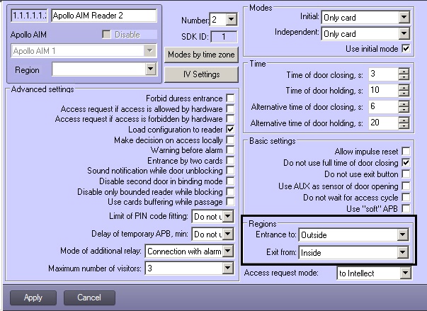 Create 2 regions in ACFA Intellect: Inside and Outside. These regions are set as entrance or exit areas for readers 1 and 2: