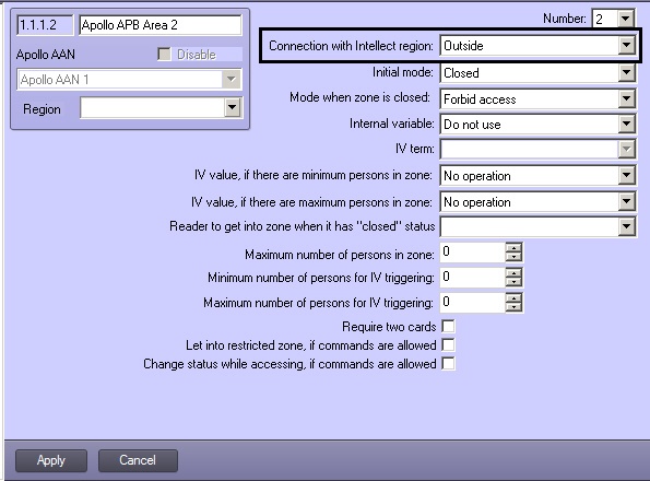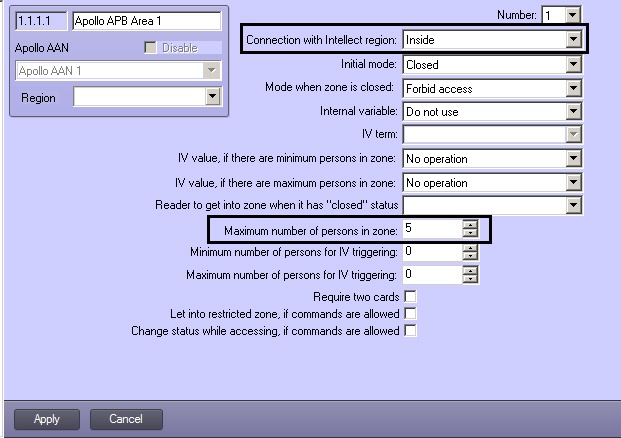 At least 2 APB areas are to be configured in the system corresponding to entrance and exit regions of a reader. The first APB zone is intended to control people count, and limits are set in it for number of users in region. The second APB area does not necessarily have limitations on user number but entrance to this zone reduces number of users in the first zone according to readers configuration.