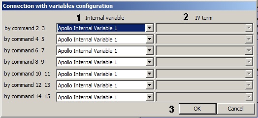 - In the drop-down list in the Internal variable column, select the Apollo Internal Variable object corresponding to the variable whose term the command from the reader should change (1).