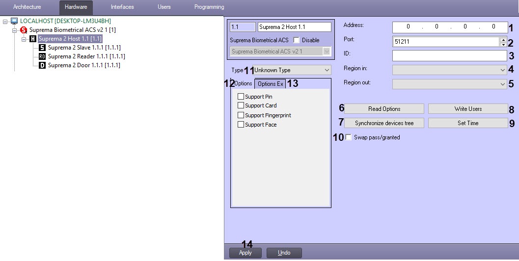 - Go to the Suprema 2 Host object settings panel. The object is created on the basis of the Suprema BiometricalACS v2 object.