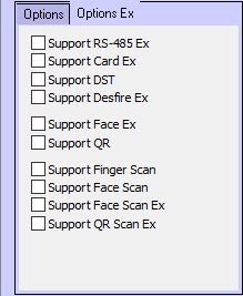 When reading the options (step 7), the checkboxes are automatically set on the Options (12) tab with the basic device features and on the Options Ex (13) tab with the advanced device features. These tabs are not editable and show the functional features of a specific type of Suprema 2 controller. The set of supported features is different for each type of Suprema 2 controller. The Options Ex tab looks like this: