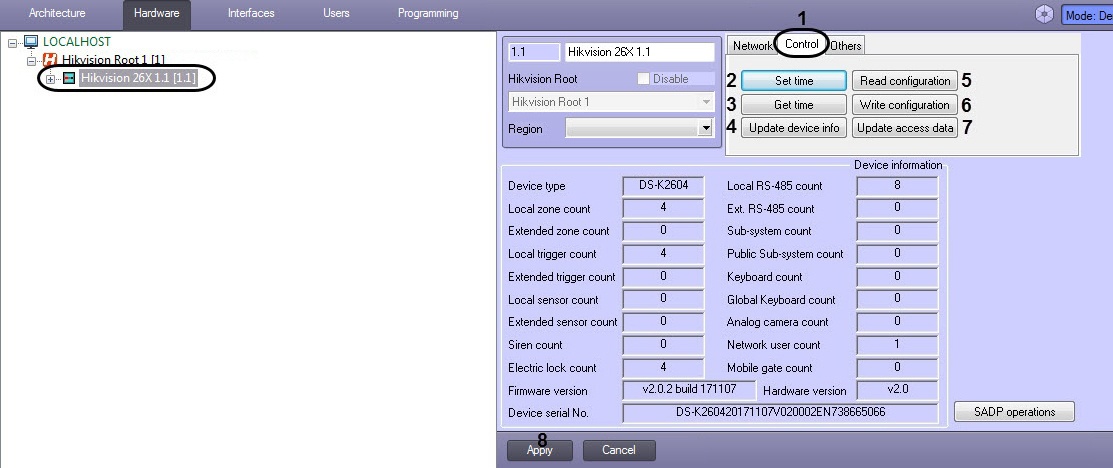 - Go to the Control tab (1) on the Hikvision 26X object configuration panel.