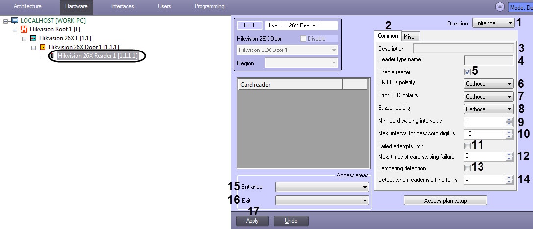 - From the Direction drop-down list (1), select the reader's direction: Exit or Entrance.