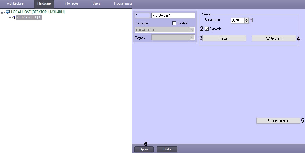- Go to the settings panel of the Virdi Server object, which is created on the basis of the Computer object on the Hardware tab of the System settings dialog window.