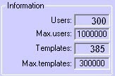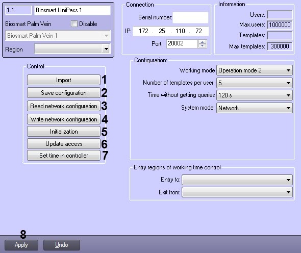 After reading the configuration, the Information block on the settings panel will be filled. It is for reference only and shows how many users are allowed to enter and how many vein patterns are registered for them, as well as the factory maximum settings.- Click the Save Configuration button (2) to save the configuration changes to controller/terminal.