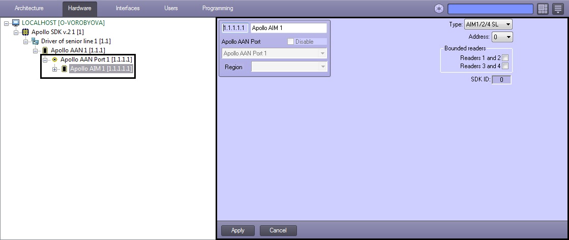 The AIM interface module is configured on the settings panel of the Apollo AIM object created on the basis of the Apollo AAN Port object.