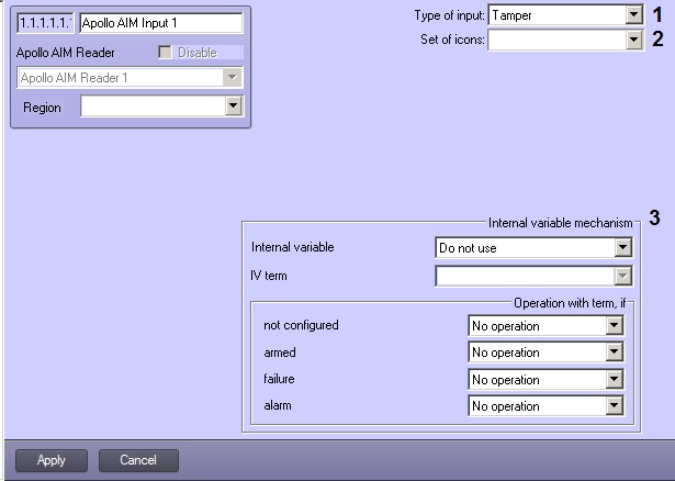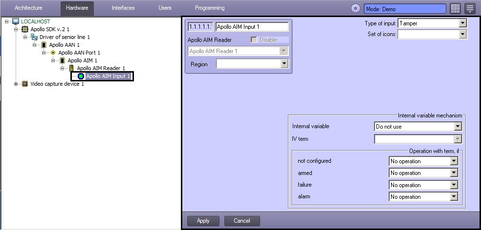 Input of AIM reader us configured on the settings panel of the Apollo AIM Input object created on the basis of the Apollo AIM Reader object.