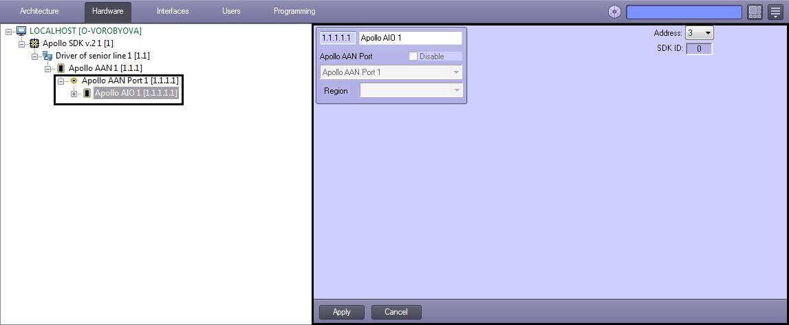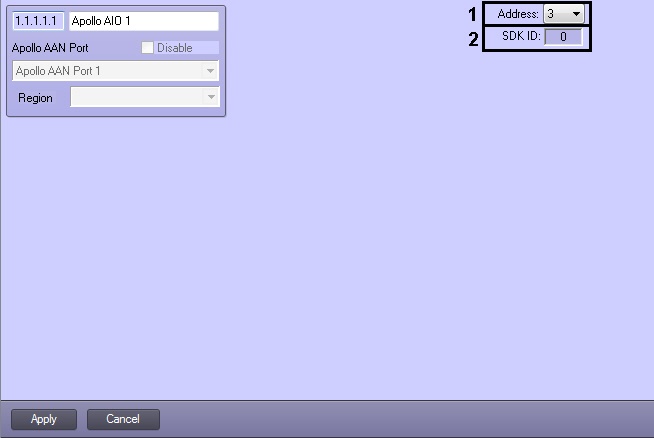 The AIO interface module is configured on the settings panel of the Apollo AIO object created on the basis of the Apollo AAN Port object.