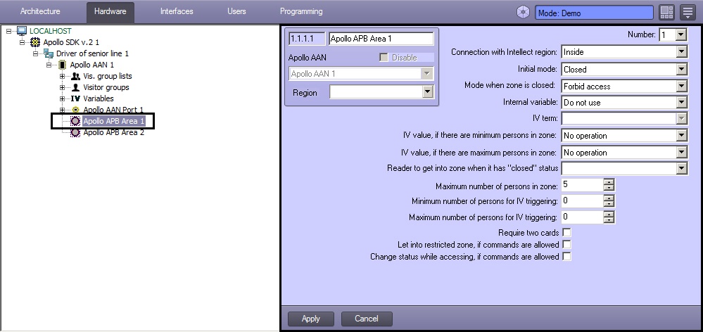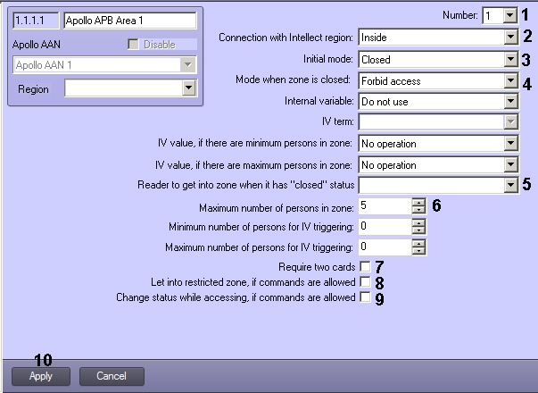 The APB Area is configured on the Apollo APB Area object settings panel, that is created on the basis of the Apollo AAN object on the Hardware tab of the System settings dialog box.