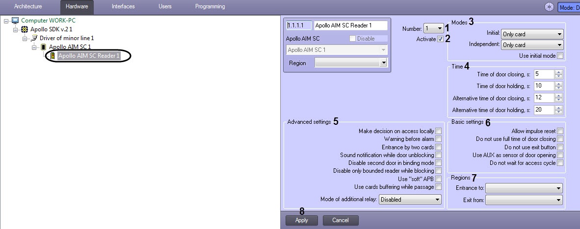 The AIM SC reader is configured on the settings panel of the Apollo AIM SC Reader object. This object is created on the basis of the Apollo AIM SC object.