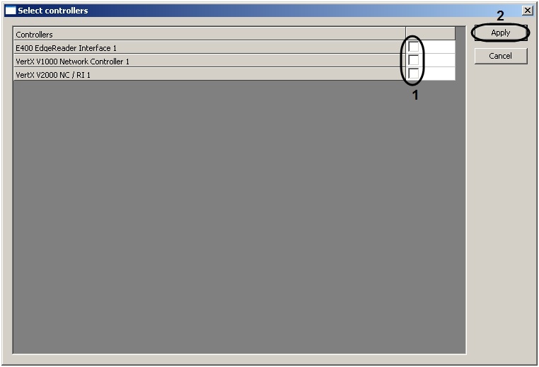 The controller selection window opens . Select the checkboxes of the controllers whose configuration (interface modules, readers, and actuators) you want to get (1).