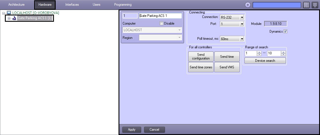 To configure the Gate ACS's connection, use the relevant Gate Parking ACS object. To create this object, go to the Settings dialog box, click the Hardware tab, and select the parent Computer object.