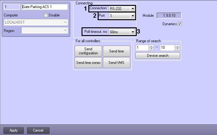 3. From the Port: drop-down list select the number of the COM port to connect to Gate ACS (2).