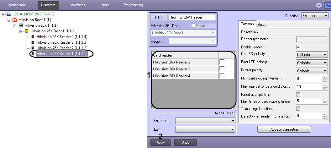 2. In the Card reader panel (1), select the checkboxes for the readers for which the anti-passback control will be set.