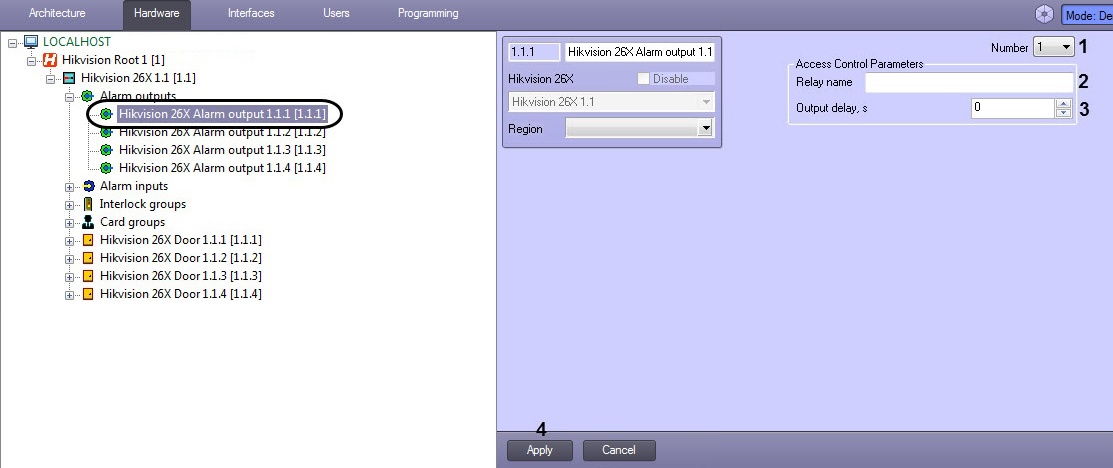 2. In the Number drop-down list (1),  you see the alarm output's ID number corresponding to its ID in the Hikvision controller. You can not change this value.