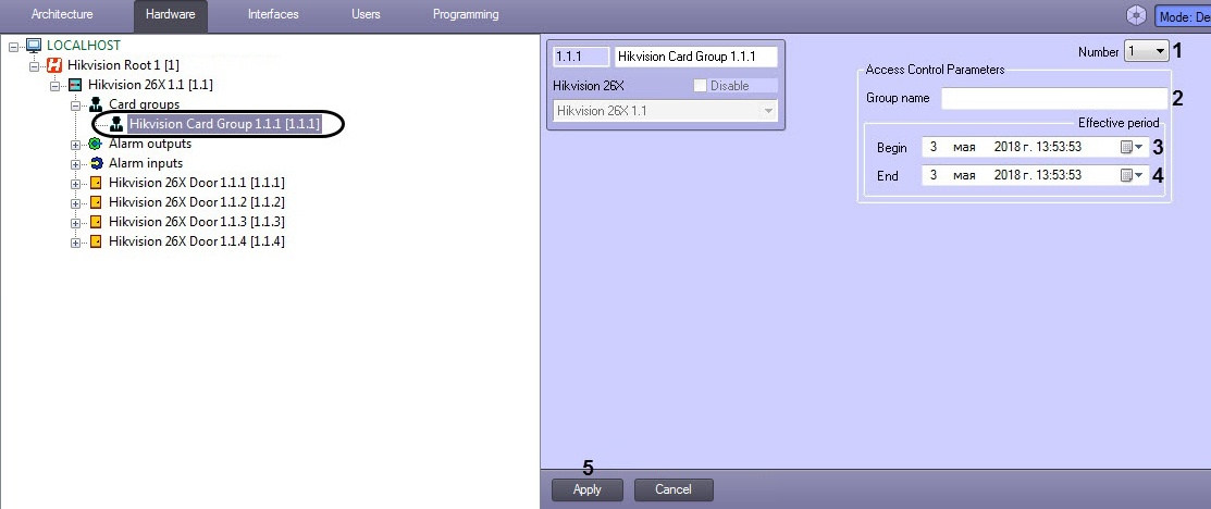 - From the Number drop-down list (1) , select ID numbers of card groups (from 1 to 32) corresponding to their ID numbers in the Hikvision controller.