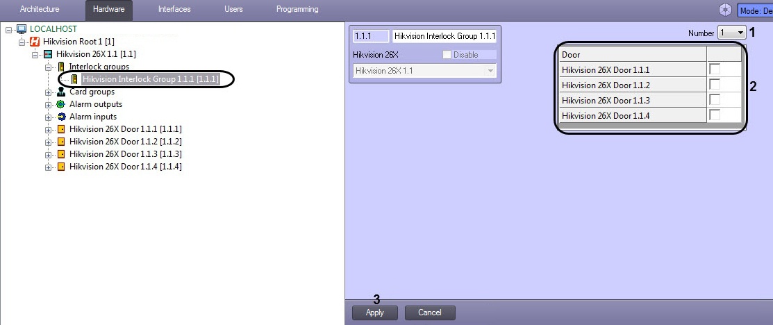 - From the Number drop-down list (1), select the interlock group number ID corresponding to this group's ID in the Hikvision controller.