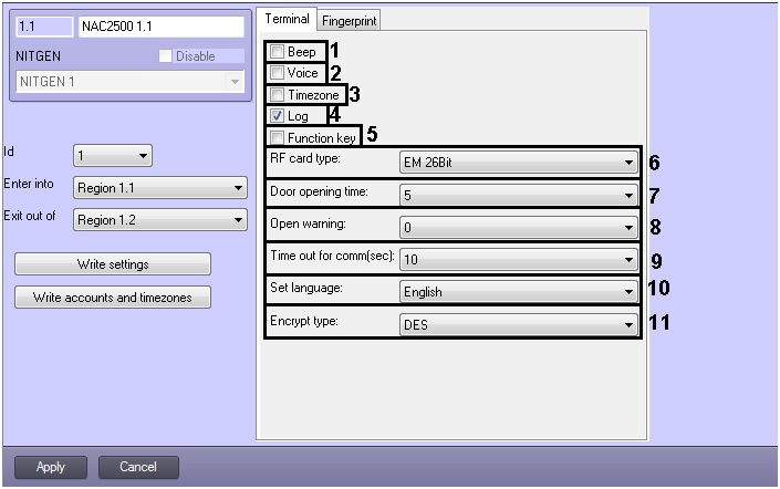 3. Set the Voice checkbox to receive voice instructions when authenticating fingerprint at the terminal (2).