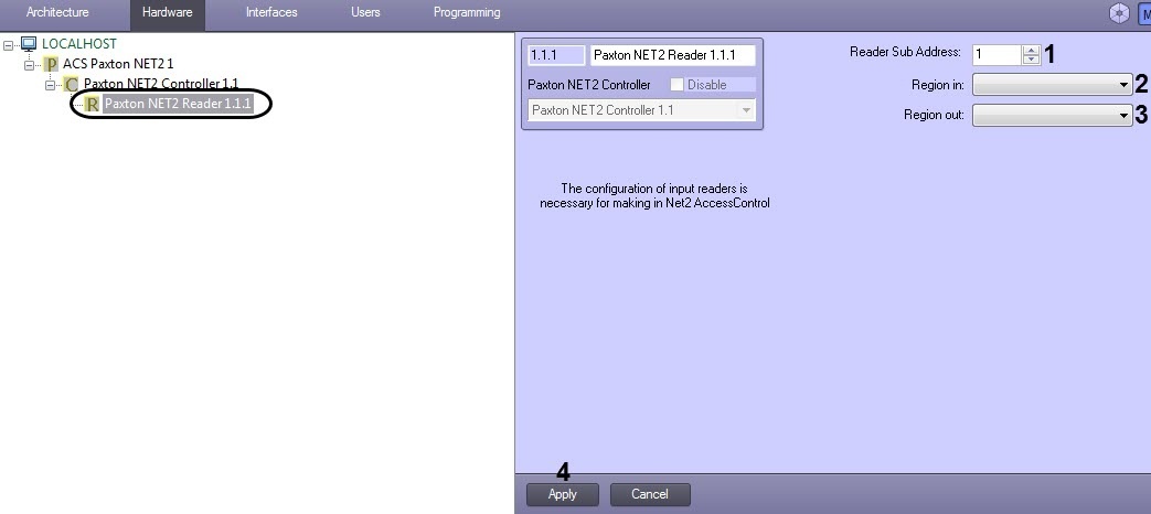- In the Reader Sub Address field using the up and down buttons, enter the hardware address of the reader connection (1).