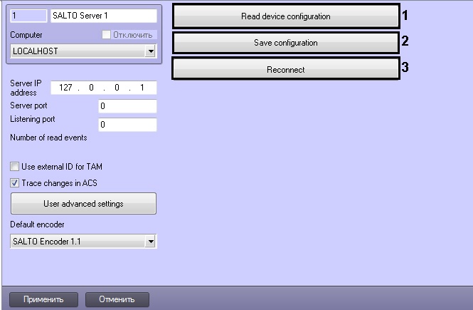 Downloading of SALTO ACS configuration is performed on the setting panel of the SALTO Server object.