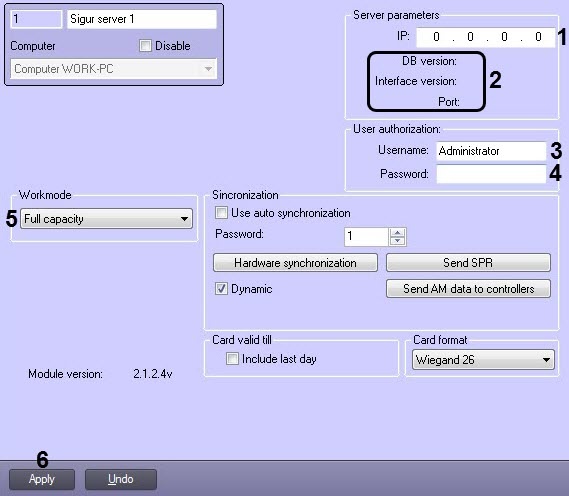 - In the Synchronization (3) and Username (4) fields, enter the username and password, respectively, used to login to the Sigur ACS Client software (see the official reference documentation for the Sigur ACS).