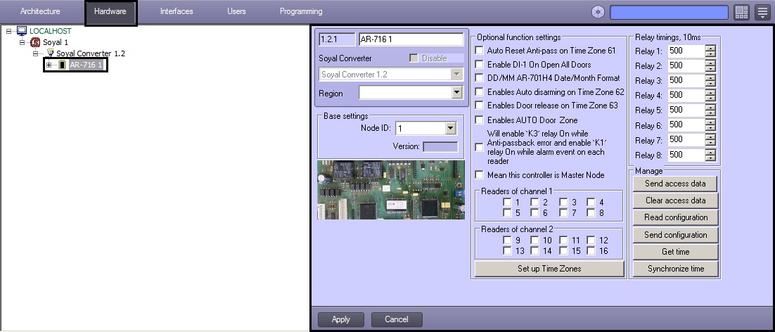 Configuration of AR-716 controller is carried out on setting panel of AR-716 object. This object is created on the basis of Soyal Converter object on Hardware tab of System settings dialog box.