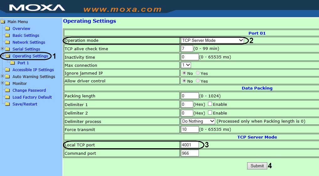- In the Operation mode drop-down list (2), select TCP Server mode.