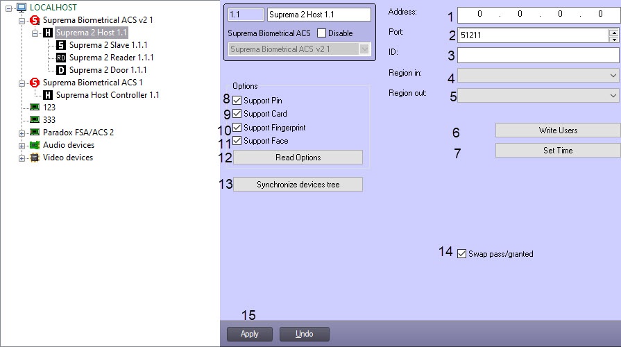 2. In the Address (1) field, set the IP-address of the Suprema 2 controller.