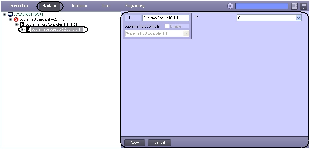 The Suprema Secure IO object is configured on the Suprema Secure IO object's settings panel. This object is created based on a Suprema Host Controller object on the Hardware tab of the System Settings dialog.