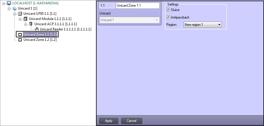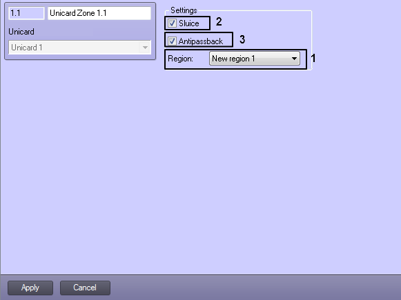 Configuring the Unicard zone is performed on the settings panel of the Unicard Zone object created on the basis of the Unicard object on the Hardware tab of the System settings dialog window.