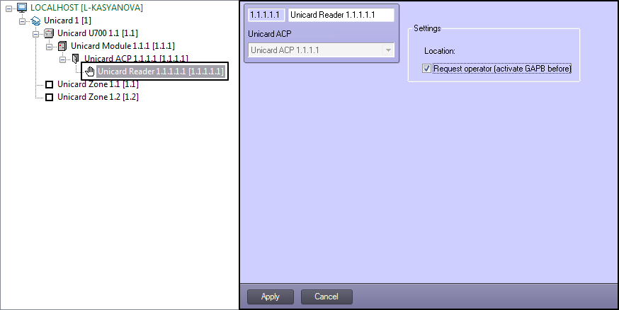 Configuring the Unicard reader is performed on the settings panel of the Unicard Reader object created on the basis of the Unicard ACP object on the Hardware tab of the System settings dialog window.