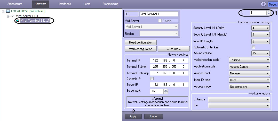 After creating the Virdi Terminal object, it is necessary to specify the identifier of this terminal in the ID field (1) and click the Apply button (2).
