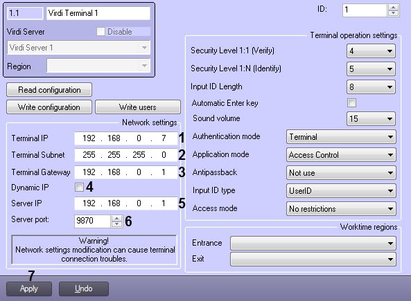 - Set the Dynamic IP checkbox (4) if the terminal operates in a network with DHCP protocol.