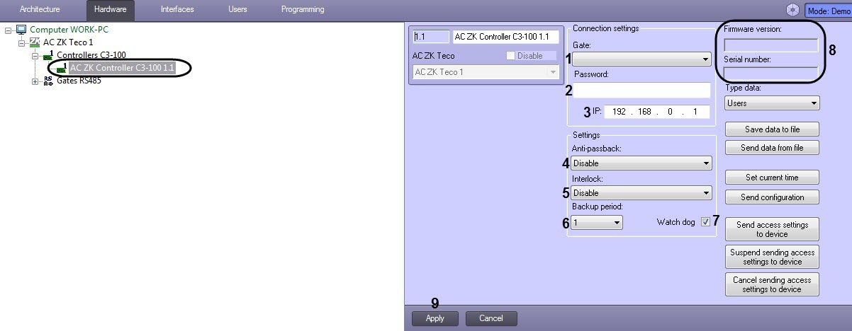 - From the Backup period drop-down list (6), select the time interval in minutes for the automatic backup of data of the specified type (see Managing the configuration of a ZK controller).