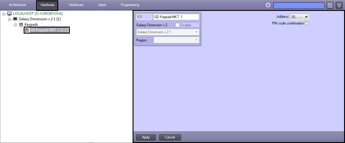 The GD Keypad MK7 object must match the Galaxy Dimension v.2 panel to which the keypad is connected.