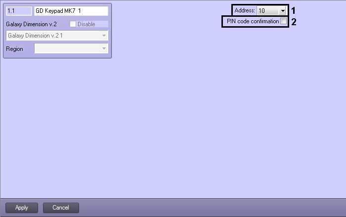 - From the Address drop-down list select the address displayed for the specific keypad into the operator’s menu of the Galaxy Dimension v.2 control panel (1).