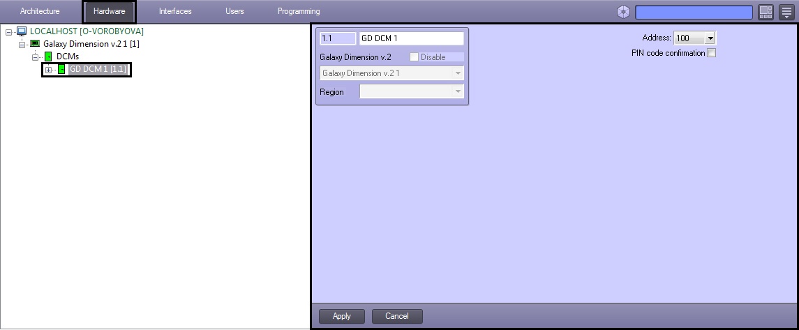 Door control modules of the Galaxy Dimension v.2 control panel are configured in the settings panel of the GD DCM object. This object is created from the Galaxy Dimension v.2 object on the Hardware tab of the System settings dialog box.