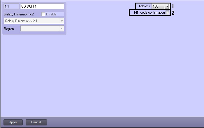 - From the Address drop-down list select the address displayed for the specific control module into the operator’s menu of the Galaxy Dimension v.2 control panel (1).