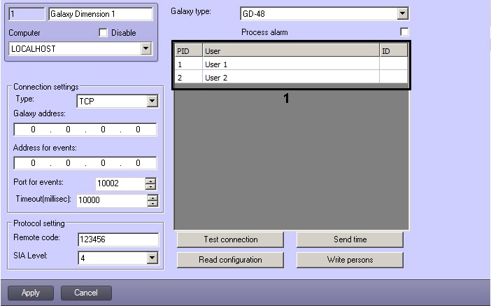 - If an ACFA Intellect user is also a user of the Honeywell Galaxy Dimension control panel, then the user’s identification number (from 0 to 255) for the panel should be entered into the ID column of table 1.