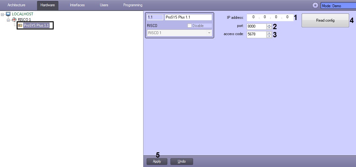 6. Click the Read config button (4) to read the configuration of the main board and build the corresponding zones and partitions in the object tree.