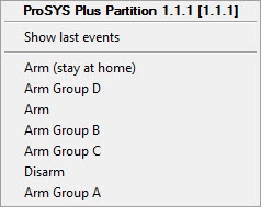RISCO partition control is performed in the Map interactive window using the ProSYS Plus Partition object function menu.