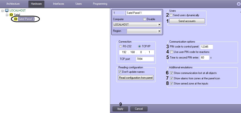 Additional settings of the integration module Satel INTEGRA are configured as follows:
