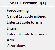 The Satel INTEGRA panel is managed in the Map interactive window using the Satel Partition object menu.