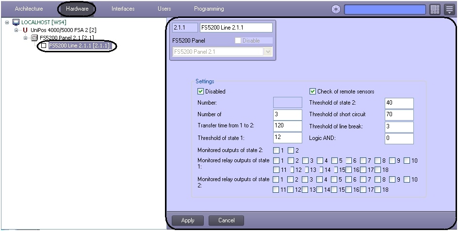The configuration of FS5200 panel lines is carried out on the setting panel of the Line object. This object is created on the basis of the FS5200 panel object on the Hardware tab of the System settings dialog box while constructing the UniPos 4000/5000 FSA object (see Construction of the UniPos 4000/5000 FSA object tree).
