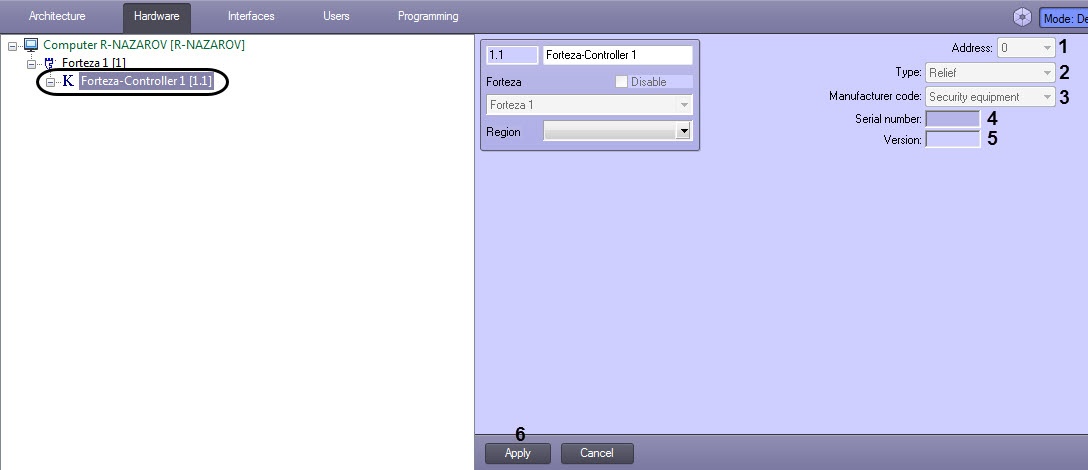 - The Address field displays ID of COM port to which the controller is connected (1).