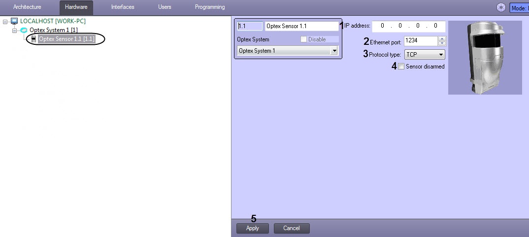 - Go to the Optex Sensor object settings panel, which is created on the basis of the Optex object.