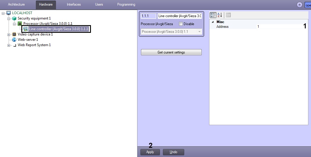 - On the basis of the Processor object, create a Line controller object that corresponds to the LC-C device, and go to its settings panel.