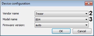 Select a Trezor device model from the Model name drop-down list (3).